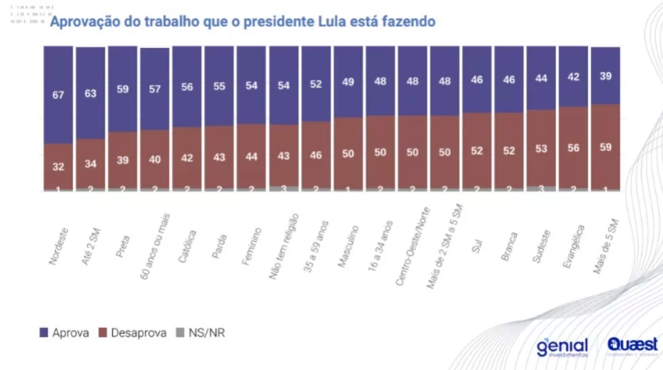 Aprovação do trabalho de Lula entre regiões e categorias. Foto: Gráfico da Pesquisa Quaest.