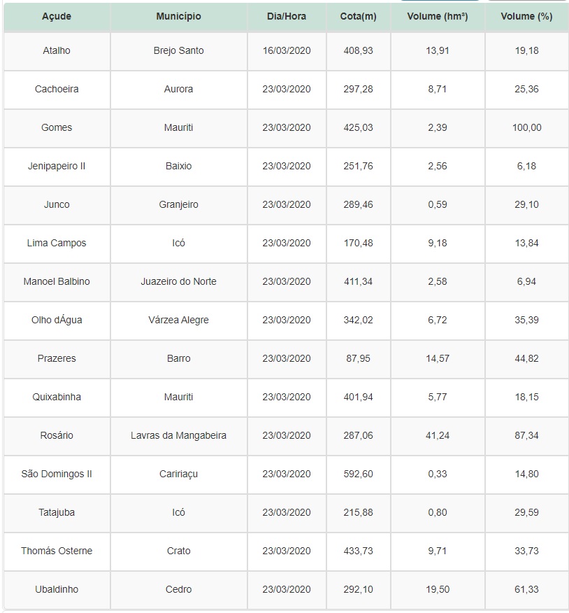A Cogerh (Companhia de Gestão de Recursos Hídricos) acompanha 15 reservatórios no Cariri, eles fazem parte da bacia do Salgado. Segundo o monitoramento, apenas um deles encontra-se com 100% do volume. Trata-se do açude Gomes, em Mauriti. O Manoel Balbino, em Juazeiro do Norte, tem 7%.