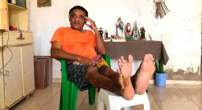 O agricultor Elias Aureliano, de 54 anos, morador do bairro Pedrinhas, precisou parar de trabalhar devido uma úlcera que adquiriu no pé e o impossibilitou exercer suas atividades.