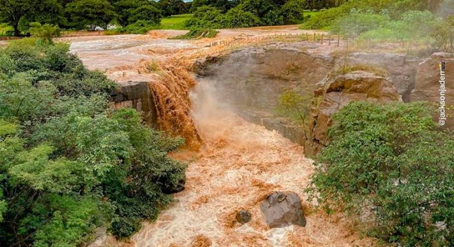 Imagens obtidas pelo Site Miséria mostram um grande volume de água na Cachoeira de Missão Velha, no Cariri, após as fortes chuvas que banharam a região durante a madrugada desta quarta-feira (15).