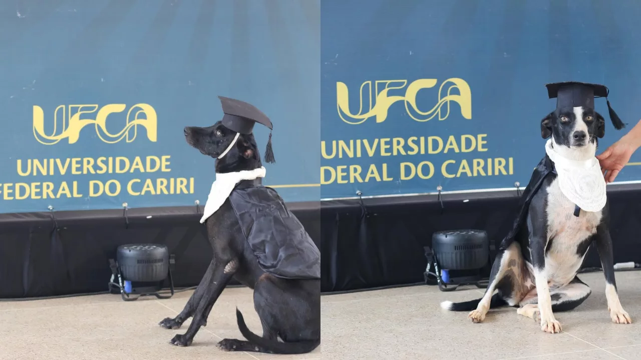 Estudantes assíduos e atentos, que acompanham aulas de diversos cursos ofertados na Universidade Federal do Cariri (UFCA), os cães assistidos pelo projeto voluntário UFCão também “colaram grau” ao lado dos universitários. Os “AUlunos” Cachorra, Chilito e Ben Jor vestiram a mini beca. O momento foi registrado e compartilhado pelo perfil oficial da instituição.