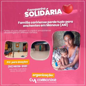 A empresa Commonike Assessoria encabeça uma campanha que visa ajudar a cratense Michele Candido, que está desabrigada em Manaus com seu marido e seu filho após enchentes destruírem a sua casa na capital do Amazonas. A cidade vem sendo afetada por fortes chuvas, que acabam causando grandes enxurradas.