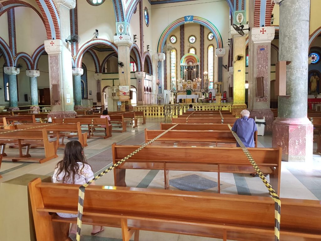 Outra medida adotada pelos Santuários foi o bloqueio de parte dos bancos. Duas fitas foram dispostas nos assentos para delimitar o espaço de uso. Só são permitidas duas pessoas por banco, cada uma deve se sentar em uma ponta.