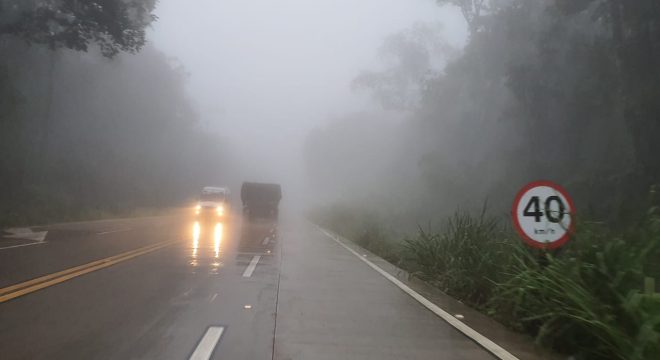 O dia amanheceu nublado e com muita névoa na Chapada do Araripe. Uma foto registra o campo de visão comprometido na CE-292, que liga o Crato ao município de Nova Olinda.