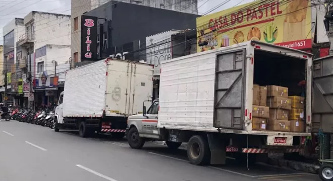 De acordo com os comerciantes, caminhões ficam estacionados nos pontos de carga e descarga, mesmo após concluírem suas atividades.
