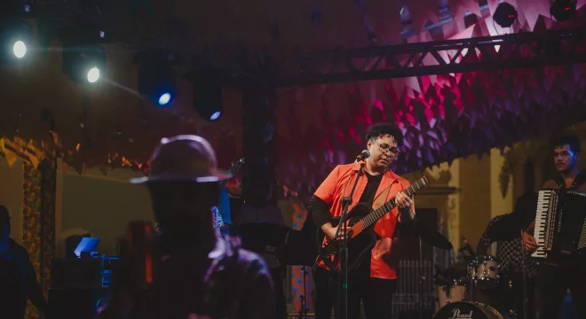 O cantor e compositor André Macambira atravessa uma pluralidade musical com canções autorais que demonstram sua raiz nordestina e forrozeira, com uma linguagem pop e descontraída.
