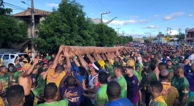 Com cerca de 23 metros e 2,5 toneladas, dezenas de pessoas carregam o mastro do padroeiro de Barbalha com muita fé.