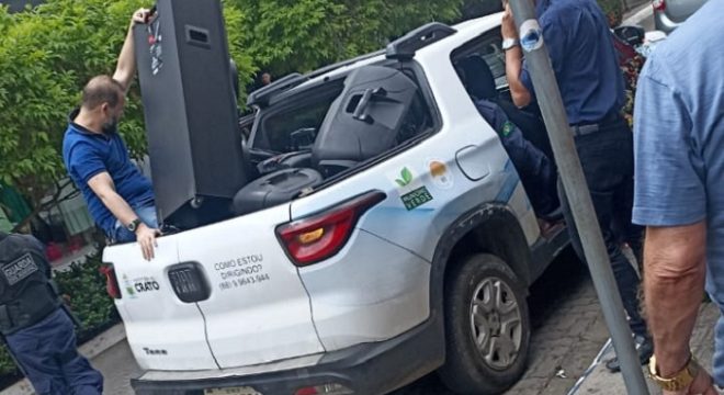 Carro da Prefeitura do Crato apreende equipamentos de som no Centro. (Foto: Reprodução)