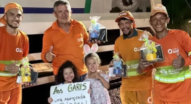 Uma família do bairro Limoeiro, em Juazeiro do Norte, se reuniu na noite da última terça-feira (15) para preparar uma surpresa especial para os garis da cidade. Com cartazes, mensagens de felicitações e rostos pintados, as crianças entregaram cestas de Páscoa aos profissionais da limpeza urbana.