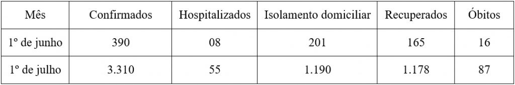 Em 1º de junho deste ano, a Secretaria de Saúde (Sesau) de Juazeiro do Norte divulgou que a cidade registrava o seguinte quadro epidemiológico: 390 casos confirmados de Covid-19 e 16 óbitos pela doença. Destes 390 confirmados, oito estavam internados, 201 estavam em isolamento domiciliar e 165 haviam se recuperado.