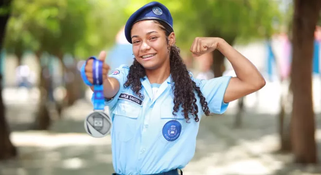 Yarla Santos, 15 anos, aluna da Escola Municipal Cívico-Militar Edvard Teixeira Férrer, foi destaque na etapa nacional dos Jogos da Juventude do Brasil, na modalidade wrestling. A estudante do 9° ano conquistou a medalha de prata na competição, que aconteceu em João Pessoa, Paraíba.