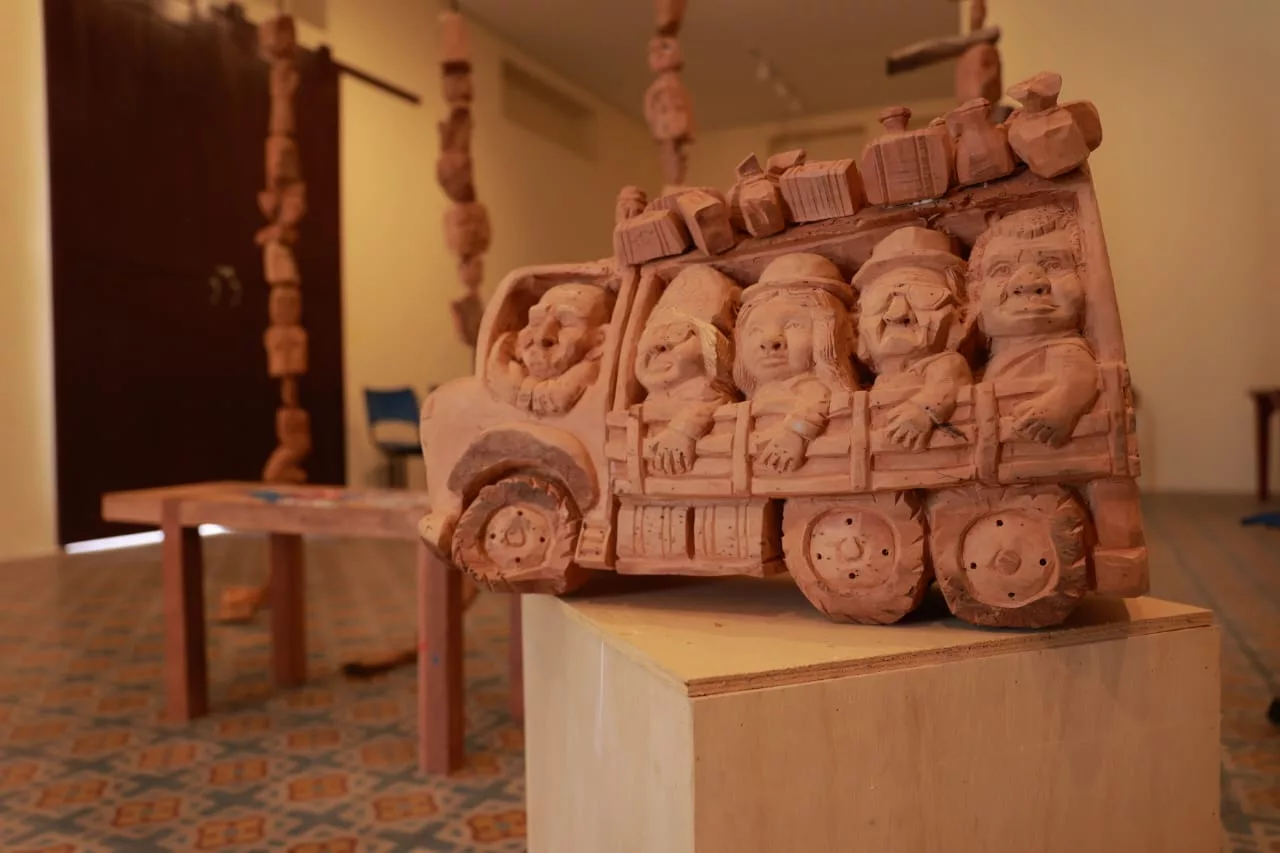 A mostra reúne esculturas e matrizes de xilogravura assinadas pelos artistas Din Alves e Erivana Darc. Embora tragam linguagens distintas, ambos partem de um mesmo ponto de origem: a madeira da umburana, elemento tradicional na produção artística popular nordestina.