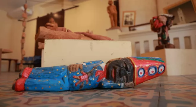 A mostra reúne esculturas e matrizes de xilogravura assinadas pelos artistas Din Alves e Erivana Darc. Embora tragam linguagens distintas, ambos partem de um mesmo ponto de origem: a madeira da umburana, elemento tradicional na produção artística popular nordestina.