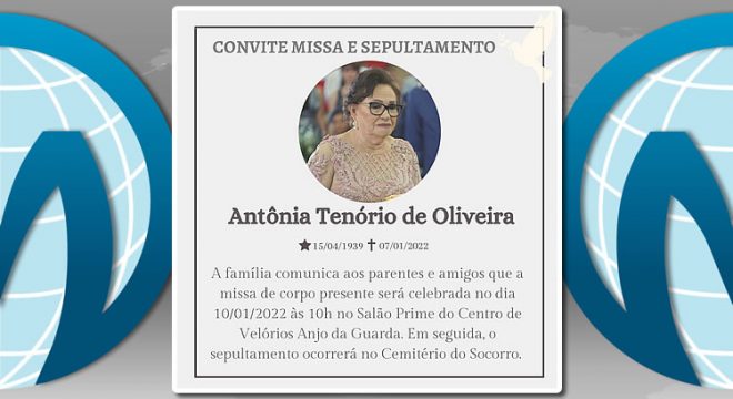 Familiares de Antônia Tenório de Oliveira convidam parentes e amigos, para missa de corpo presente da comerciante nesta segunda-feira (10), às 10h no Salão Prime do Centro de Velórios Anjo da Guarda. O sepultamento acontecerá no cemitério do Socorro, em Juazeiro do Norte.