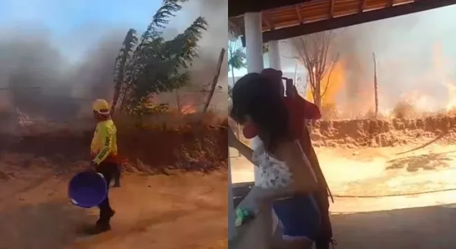 Uma família passou por momentos de tensão no Sítio Varas, na zona rural de Várzea Alegre, no Cariri, após um incêndio de grandes proporções atingir a localidade nesta terça-feira (5). Um vídeo divulgado nas redes sociais mostra as chamas a poucos metros da residência.