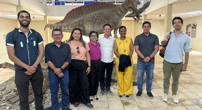Comitiva do Le Monde junto a direção do Museu Plácido Cidade Nuvens, em Santana do Cariri. Foto: Ascom/ URCA.