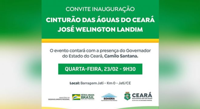 O Governo do Estado do Ceará entrega nesta quarta-feira (23) o Cinturão das Águas do Ceará, na barragem de Jati. Com o nome de José Welington Landim, a obra transfere água para outras regiões do Cariri e também para o Castanhão.