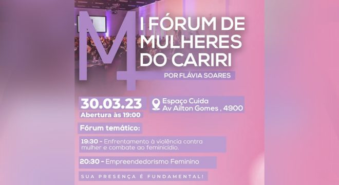 Nesta quinta-feira (30), o Espaço Cuida recebe o I Fórum de Mulheres do Cariri. O evento acontece a partir das 19 horas, na Av Ailton Gomes, 4900 e é idealizado pela advogada juazeirense Dra Flávia Soares. A programação conta com palestras sobre empreendedorismo e enfrentamento à violência contra mulher.