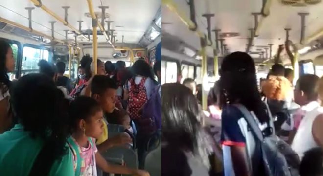 Nas imagens registradas na manhã desta sexta-feira (27), é possível ver alunos em pé no ônibus escolar que faz a rota dos estudantes que moram no conjunto habitacional Minha Casa Minha Vida, localizado no bairro Barro Branco.