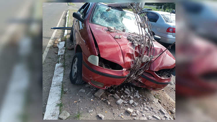 O automóvel colidiu com um poste após uma falha na direção. Apesar do grave acidente, os dois saíram apenas com pequenos ferimentos pelo corpo devido o impacto da batida.