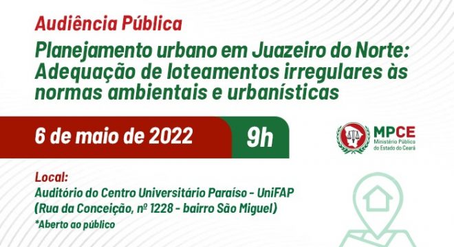 O Ministério Público do Estado do Ceará (MPCE), anunciou nesta quarta-feira (27) que ocorrerá uma audiência pública promovida pelo órgão, com o objetivo de discutir e apresentar soluções para a adequação às normas ambientais e urbanísticas de loteamentos irregulares em Juazeiro do Norte.