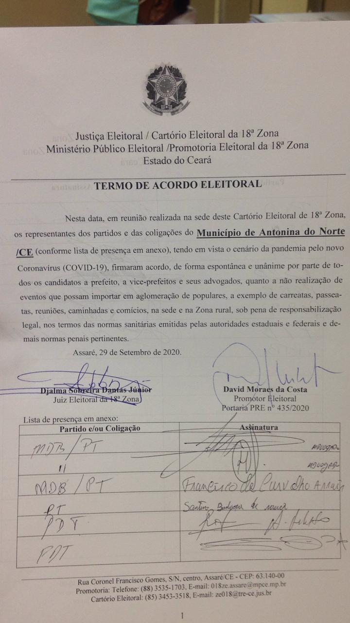 A Justiça e os candidatos em Assaré, Antonina do Norte e Tarrafas firmaram nesta terça (29), um acordo para uma campanha segura. De acordo com o documento assinado durante reunião com o juiz Djalma Sobreira Dantas Júnior, estão vedadas as ações de campanha que gerem qualquer tipo de aglomeração. Carreatas, comícios, reuniões e passeatas não deverão, portanto, ocorrer nesse municípios.4