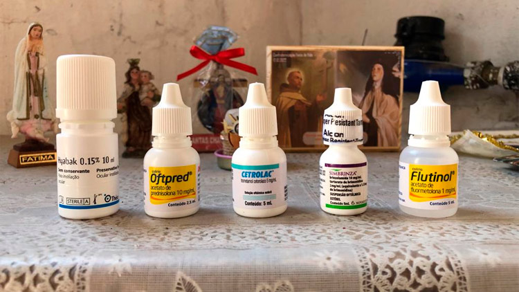 O filho sofre de uma doença que afeta a visão, e exige o uso contínuo de uma série de colírios.
