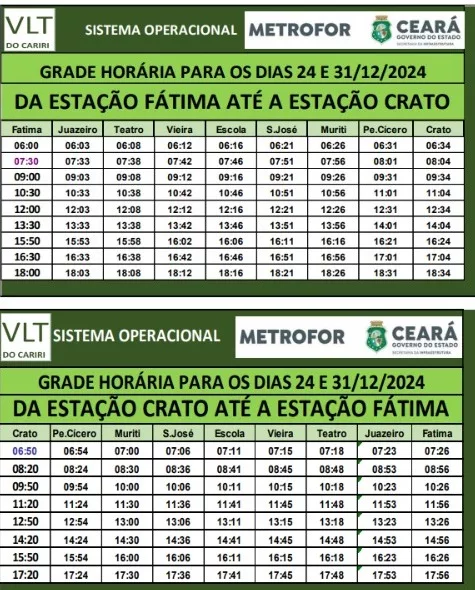 O Metrofor, responsável pela operação do VLT do Cariri, informou neste domingo (22) sobre os ajustes nos horários de funcionamento durante os feriados de Natal e Ano Novo.