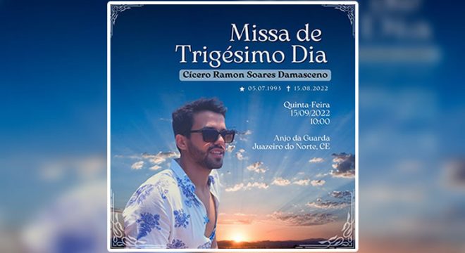 A família do médico Cícero Ramon Soares Damasceno, falecido no último dia 15 de agosto, anunciou que a celebração da missa de um mês de falecimento do mesmo, acontece às 10h desta quinta-feira (15), no Anjo da Guarda, em Juazeiro do Norte.