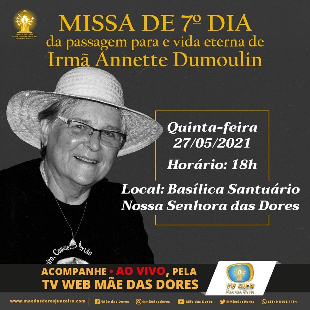 A missa de 7º Dia da Irmã Annette Dumoulin será nesta quinta-feira (27), a partir das 18h. A cerimônia acontecerá na Basílica Santuário de Nossa Senhora das Dores. Para evitar aglomerações e respeitar as medidas de segurança contra o coronavírus, a Basílica receberá apenas 25% da sua capacidade total e irá transmitir a celebração ao vivo para aqueles que não puderem estar presentes. A transmissão será realizada através da TV WEB Mãe das Dores.
