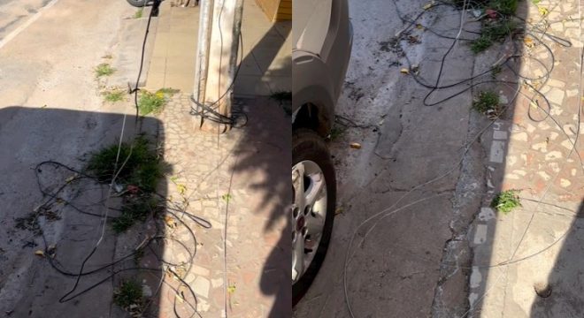 Um emaranhado de fios de provedores de internet desprendidos de postes chamou a atenção de um morador da Rua Pio X, em Juazeiro do Norte. Em vídeo publicado nas redes sociais, ele alerta sobre os riscos de acidentes que podem ser causados pelos cabos. “Já ocorreram muitos acidentes fatais por causa desses fios”, alertou.