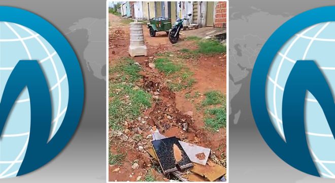 Em vídeo encaminhado à redação do Miséria, um morador narra como se encontra a rua. As imagens mostram que as primeiras chuvas do mês arrastaram parte do calçamento, abrindo uma cratera por onde passa a tubulação.