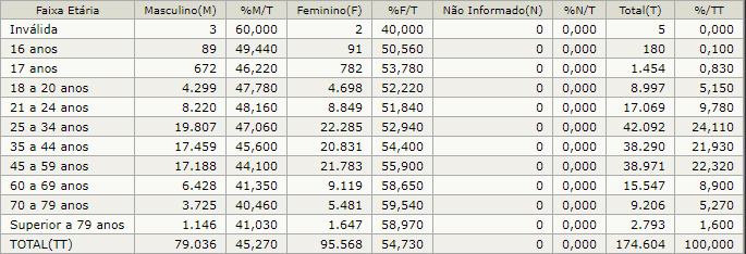 Em 10 das 11 faixas etárias reconhecidas pelo TSE, as mulheres representam a maioria dos eleitores. No entanto, é importante ressaltar que a maioria das mulheres aptas a votar este ano tem entre 25 e 59 anos. Esse grupo soma 64.899 eleitores.