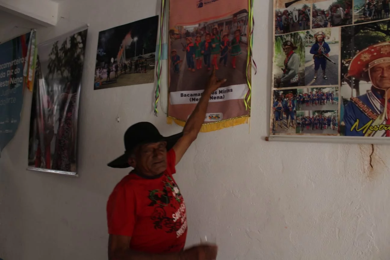 “Então, aqui, nós ensaiamos, nós ensaiamos, sentávamos, fazíamos as conversas, sentávamos. Aí cada um dava a sua opinião sobre o nome do que ia colocar no grupo. Aí teve uma das brincantes que disse: vamos botar o nome de Bacamarteiros da Paz. Eu disse pronto, não precisa outro. Esse pegou. Esse aqui, esse está bom demais, porque é uma brincadeira que a gente sabe que o Bacamarte é uma arma, mas eu faço esse trabalho é porque ele veio e eu abracei. Não é porque eu faço apologia à violência, não, muito contrário. Eu gosto da paz, então, o nome deu certo. Deu certo ali”, contou enquanto apontava o local em que o nome foi decidido.