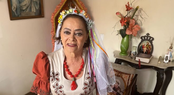 Conhecida popularmente como a Solteirona de Barbalha, Socorro reinventa as tradições há 23 anos, e com a ajuda de Santo Antônio, repassa as simpatias para os “solteirões” que querem se casar.