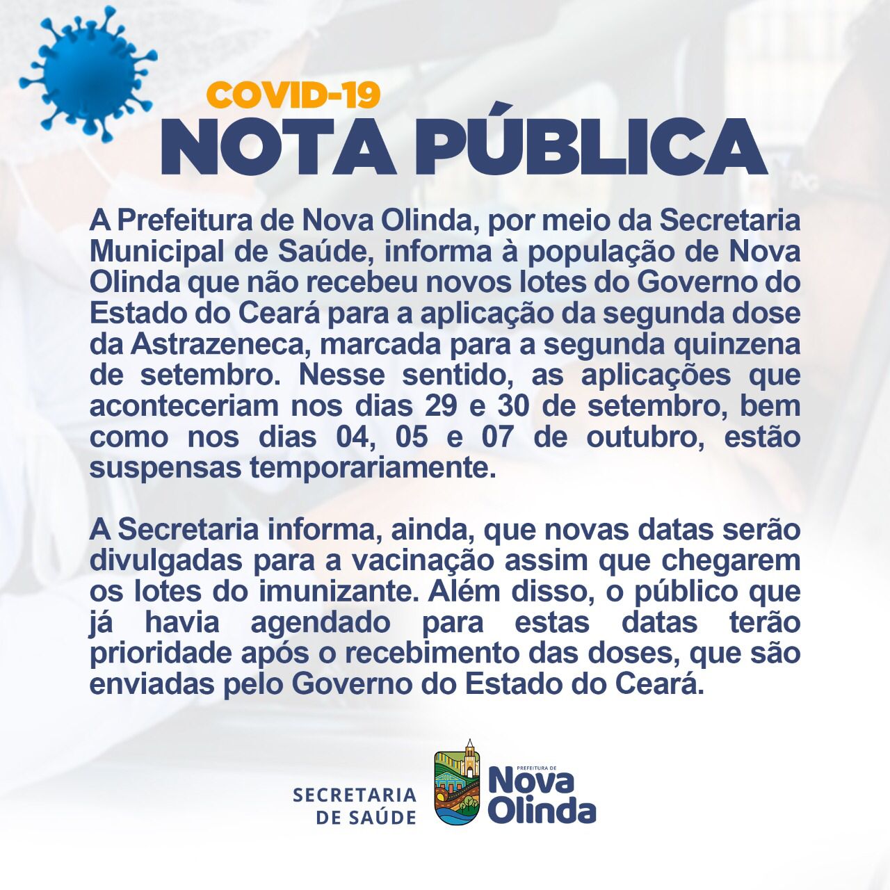 A Prefeitura de Nova Olinda, por meio da Secretaria Municipal de Saúde, emitiu nota nesta quarta-feira (29) afirmando não ter recebido novos lotes, por parte do Governo do Ceará, da vacina contra Covid-19 Oxford/Astrazeneca para a aplicação da segunda dose, marcada para a segunda quinzena de setembro. Problemas dessa natureza já vêm sendo relatados por diversos outros municípios do país.