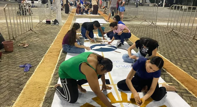 Os tradicionais tapetes para a “Solenidade do Santíssimo Corpo e Sangue de Cristo”, celebrada na Basílica Santuário Nossa Senhora das Dores, em Juazeiro do Norte, foram confeccionados por membros de pastorais, movimentos e comunidades pertencentes à instituição religiosa.