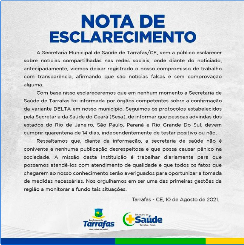 No fim da tarde desta terça-feira (10) a Prefeitura de Tarrafas emitiu uma nota de esclarecimento negando ter um caso confirmado da variante Delta do coronavírus. De acordo com a gestão, “são notícias falsas e sem comprovação alguma”.