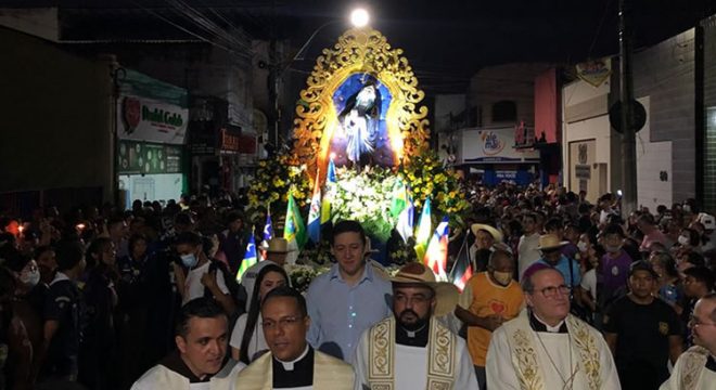 À frente do carro-andor – com a imagem da padroeira ornamentada com bandeiras de estados nordestinos – guiaram os fieis, o bispo da Diocese de Crato, Dom Magnus Henrique e o reitor da basílica, Padre Cícero José.