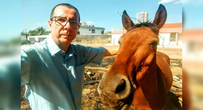 Professor Jeorge Ulisses ao lado do cavalo que salvou. (Foto: Reprodução/Arquivo Pessoal)