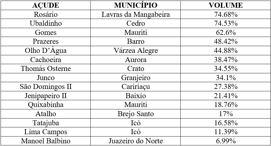 Saiba o volume dos açudes da Bacia do Salgado após as chuvas dos últimos 30 dias: