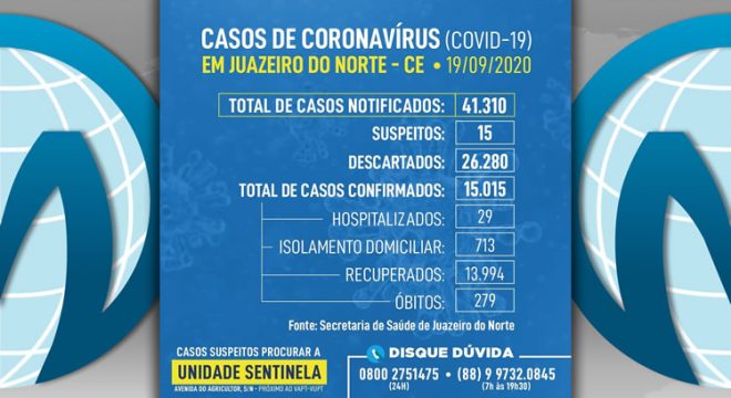 A Secretaria da Saúde de Juazeiro do Norte confirmou dois óbitos por coronavírus no município. Ao mesmo tempo, solidariza-se com os familiares dos pacientes. Os óbitos ocorreram no dia 18 de setembro. Trata-se de uma mulher, de 56 anos; e um homem, de 57 anos, ambos com comorbidade.