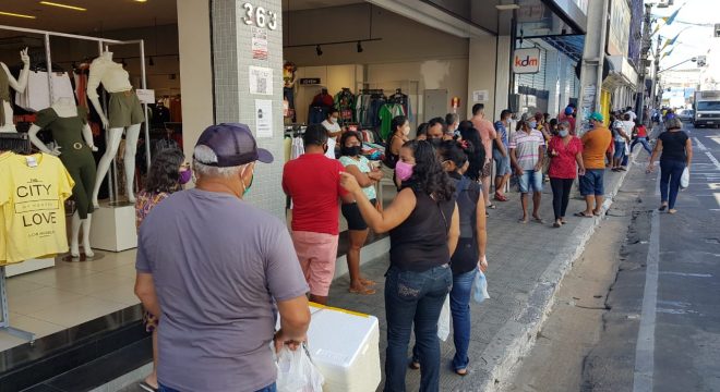 Nesta segunda-feira (24) as ruas do centro comercial de Juazeiro do Norte amanheceram lotadas. Além dos transeuntes, dezenas de pessoas aguardavam atendimento nas filas da Caixa Econômica Federal (CEF).