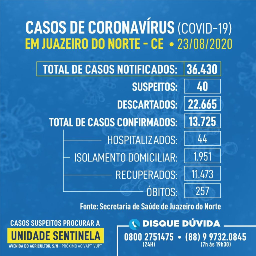 Até este domingo (23), Juazeiro do Norte registrava 1.995 pessoas diagnosticadas com Covid-19. Destas, 1.951 estão em isolamento domiciliar e as outras 44, infelizmente, apresentaram sinais graves da doença e estão recebendo tratamento hospitalar.