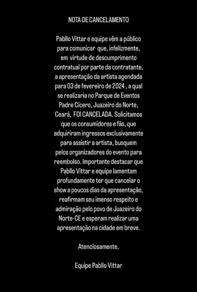 Em nota publicada na conta oficial de Pabllo no Instagram, a artista afirmou que o cancelamento se deu em face do “descumprimento contratual por parte da contratante”. No texto, que ainda está disponível na página da drag, é indicado que as pessoas que já haviam adquirido o ingresso para a apresentação busquem os organizadores para que consigam obter o reembolso.