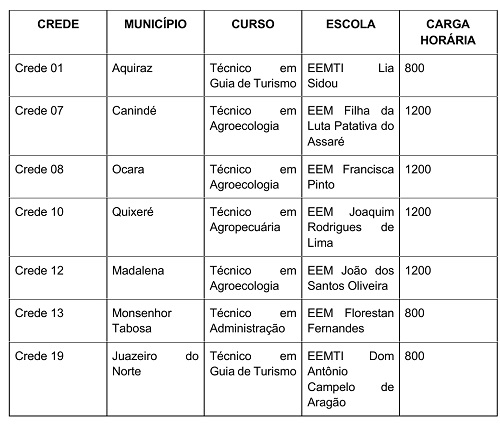 No caso dos alunos de Juazeiro do Norte, o curso Técnico disponível é em Guia de Turismo, com carga horária de 800 ha. Outras escolas localizadas nos municípios de Aquiraz, Canindé, Madalena, Monsenhor Tabosa, Ocara e Quixeré estão sendo contempladas com cursos de Técnico em Agroecologia (1.200 horas-aula), Técnico em Agropecuária (1.200 horas-aula) e Técnico em Administração (800 horas-aula).