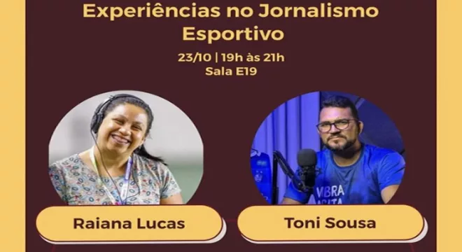 Nesta quarta-feira (23), das 19h às 21h, haverá uma roda de conversa sobre jornalismo esportivo. Os convidados são os cronistas esportivos, Raiana Lucas e Toni Sousa. A ideia é abordar as experiências profissionais, em torno da realidade do jornalismo esportivo na região do cariri e como é impactado pela falta de estrutura. Será um diálogo com estudantes e simpatizantes dessa importante área do jornalismo.