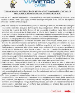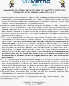 Em atuação no município desde 2016, a empresa diz, ainda, ter notificado a Prefeitura de Juazeiro do Norte sobre a situação por quatro vezes. O aumento no valor de insumos de manutenção dos veículos e a queda no número de passageiros pagantes, face à pandemia de Covid-19, também são mencionados.