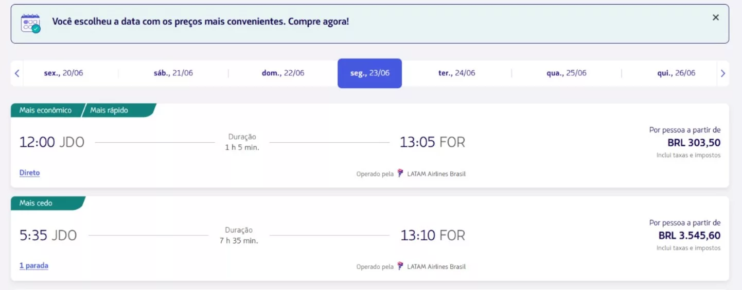 O voo que liga Juazeiro do Norte a Fortaleza, com início a partir do dia 23 de junho, pela LATAM Brasil, tem passagens a partir R$ 303, de acordo com pesquisa realizada no site da companhia na manhã deste sábado (12). O valor inclui taxas e impostos.