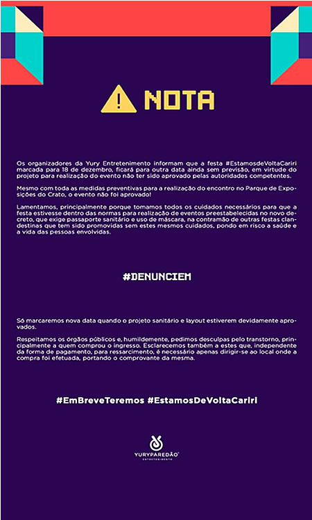 O evento foi anunciado afirmando que seriam respeitados os protocolos de segurança. No último dia 4, a Prefeitura Municipal de Crato, através da Secretaria de Saúde (SMS), divulgou nota direcionada ao público indicando que a festa não tinha o principal: autorização para acontecer.